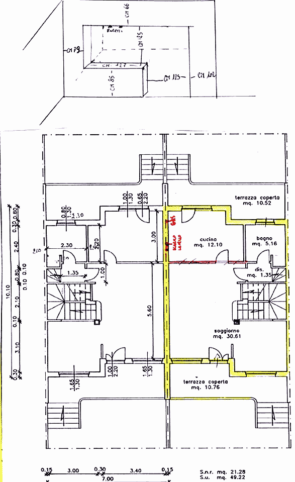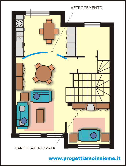 M'interesserebbe avere la vostra consulenza sull''arredamento del soggiorno-cucina. Nella piantina la mia casa è quella segnata in giallo, ma le 2 case sono esattamente speculari anche come misure. La parete che divide il soggiorno dalla cucina (segnata in rosa) ha una forma simile a quella nello schizzo allegato (senza porta e con la penisola). L''esigenza è quella di mantenere inalterata la ensazione di ampiezza e la luminosità che deriva dall''apertura tra soggiorno e cucina ma al tempo stesso trovare una soluzione che permetta di impedire la vista della cucina (se p. es. è in disordine) agli estranei. Ringrazio anticipatamente