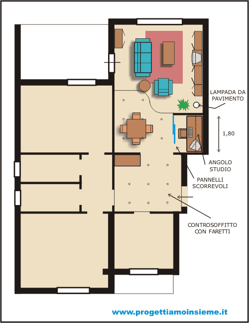La soluzione per ottenere uno studio è quella di ricavare un piccolo “closet” all’angolo interno dell’ampio soggiorno, che non interferisce con l’organizzazione degli spazi e dei passaggi. Questo vano “cieco” è delimitato da un tramezzo in muratura e da due pannelli scorrevoli, che possono essere delle vetrate artistiche o in legno dipinto. Una controsoffittatura con faretti costituisce un motivo di raccordo tra il vano ed il resto del soggiorno e diventa anche una caratteristica rilevante dell’intero ambiente. Completano l’arredamento un divano, una poltrona ed un tavolino che formano la zona conversazione.